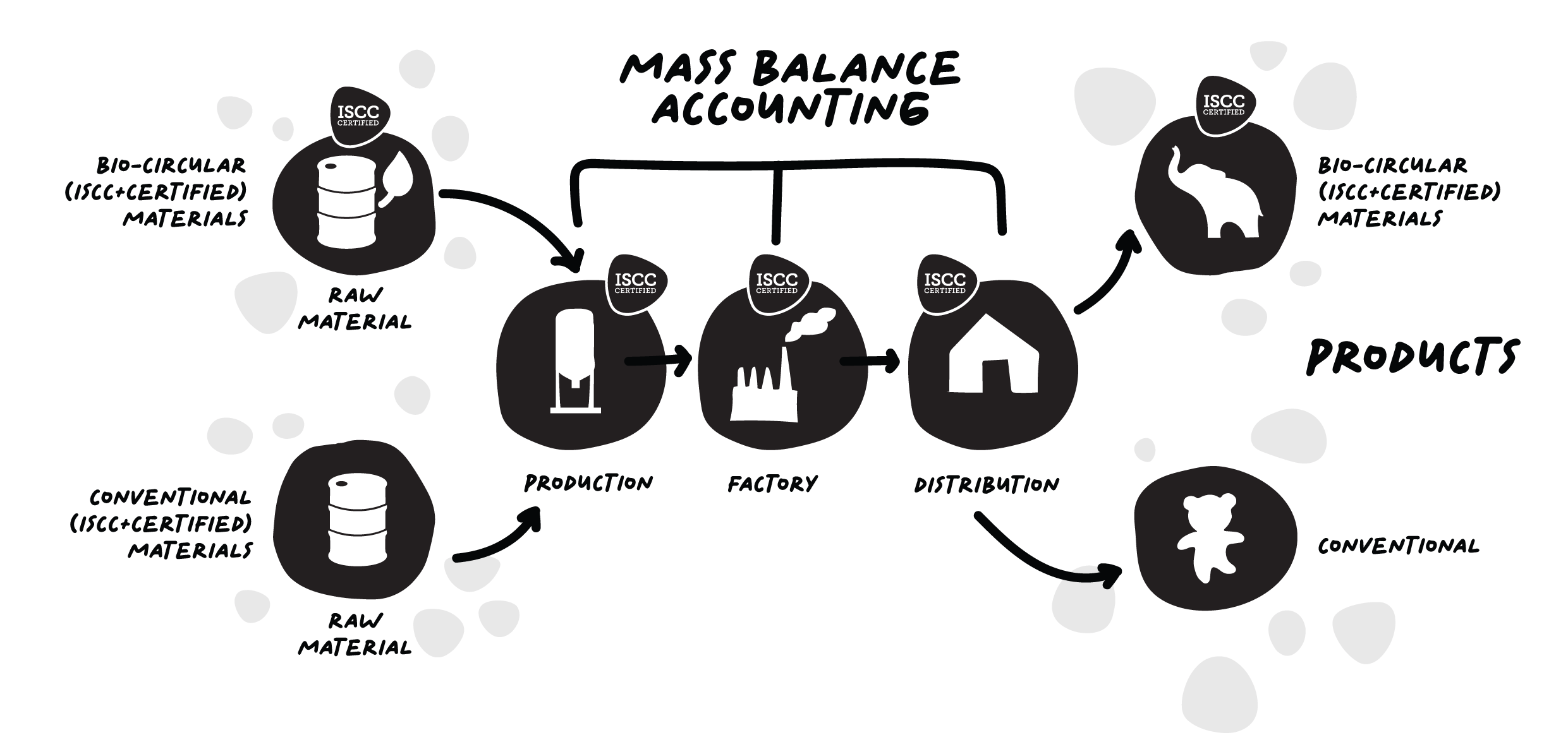 ISCC+ is an internationally recognized certification system for sustainable raw materials. It allows manufacturers to use bio-circular and recycled feedstocks through a mass balance approach. This means renewable material is introduced at the start of the supply chain and then allocated to our products based on measured quantities and verified accounting — not marketing claims. Every step is tracked, audited, and certified to ensure that the amount of sustainable material we claim matches the amount that enters the system.